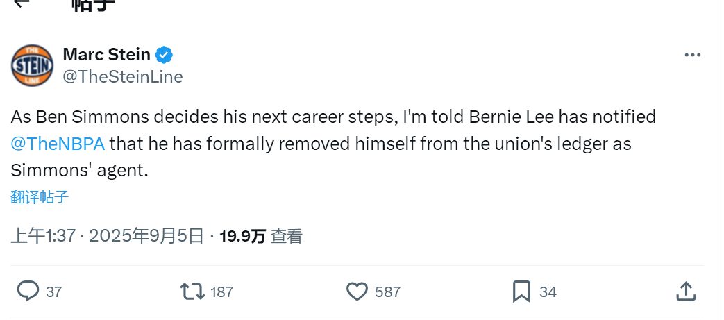 北京时间9月5日,据NBA名记Marc Stein报道,经纪人伯尼-李已正式通知NBA球员工会,自己和本-西蒙斯分道扬镳,双方正式解约。值得一提的是,这是两年半之内,西蒙斯第二次跟经纪人解约了,他上一个经纪人是里奇-保罗。